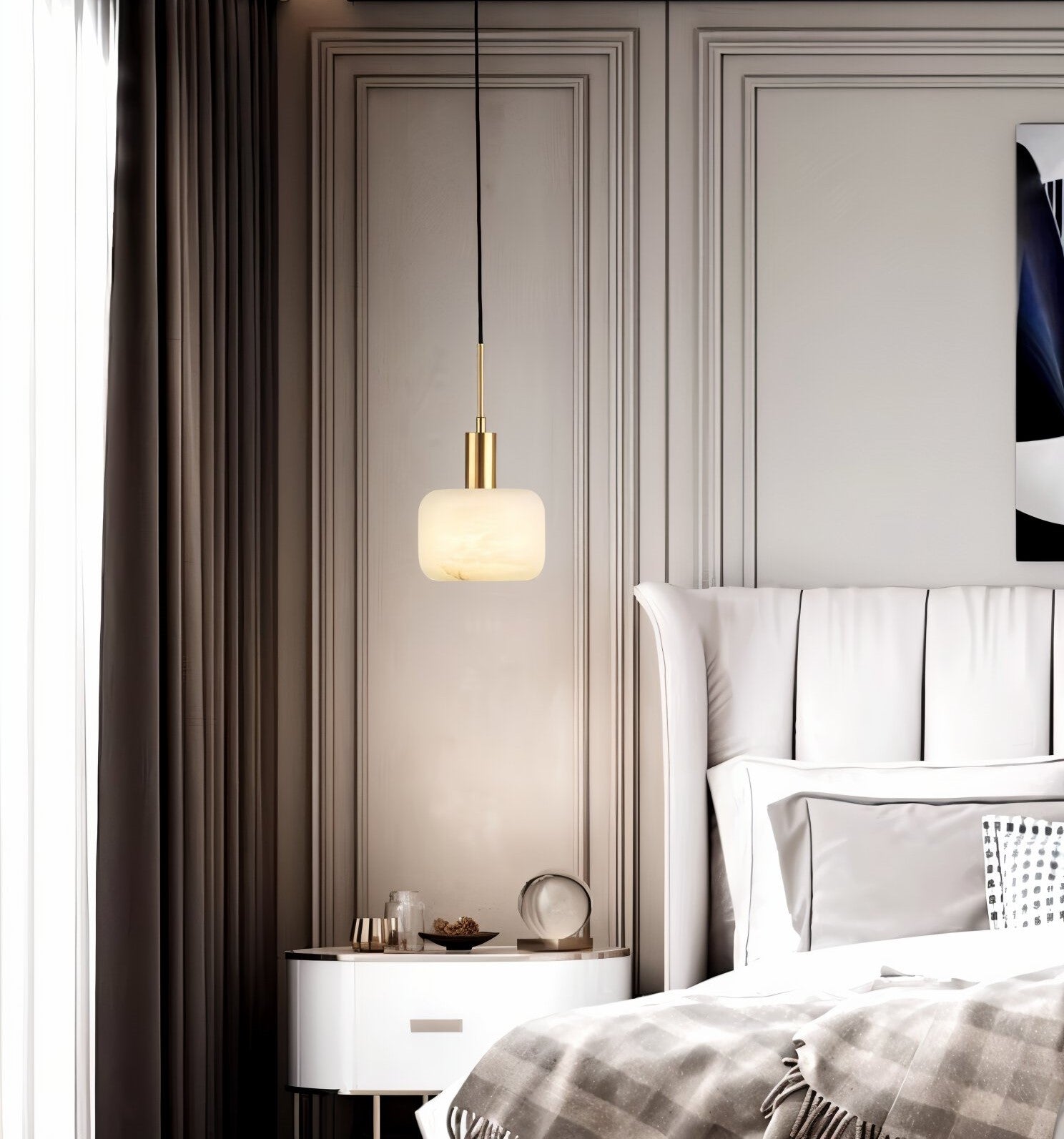 The Rubi pendant light showcases an exquisite marriage of brass and alabaster, crafting a refined and contemporary statement piece. Its sleek cylindrical alabaster shade gracefully filters light, producing a radiant, organic luminescence that transforms any environment. The metallic brass details add opulent sophistication, beautifully harmonizing with the natural stone's rich textures. Perfect for modern or transitional settings, this fixture embodies enduring elegance while delivering sumptuous ambient illumination.