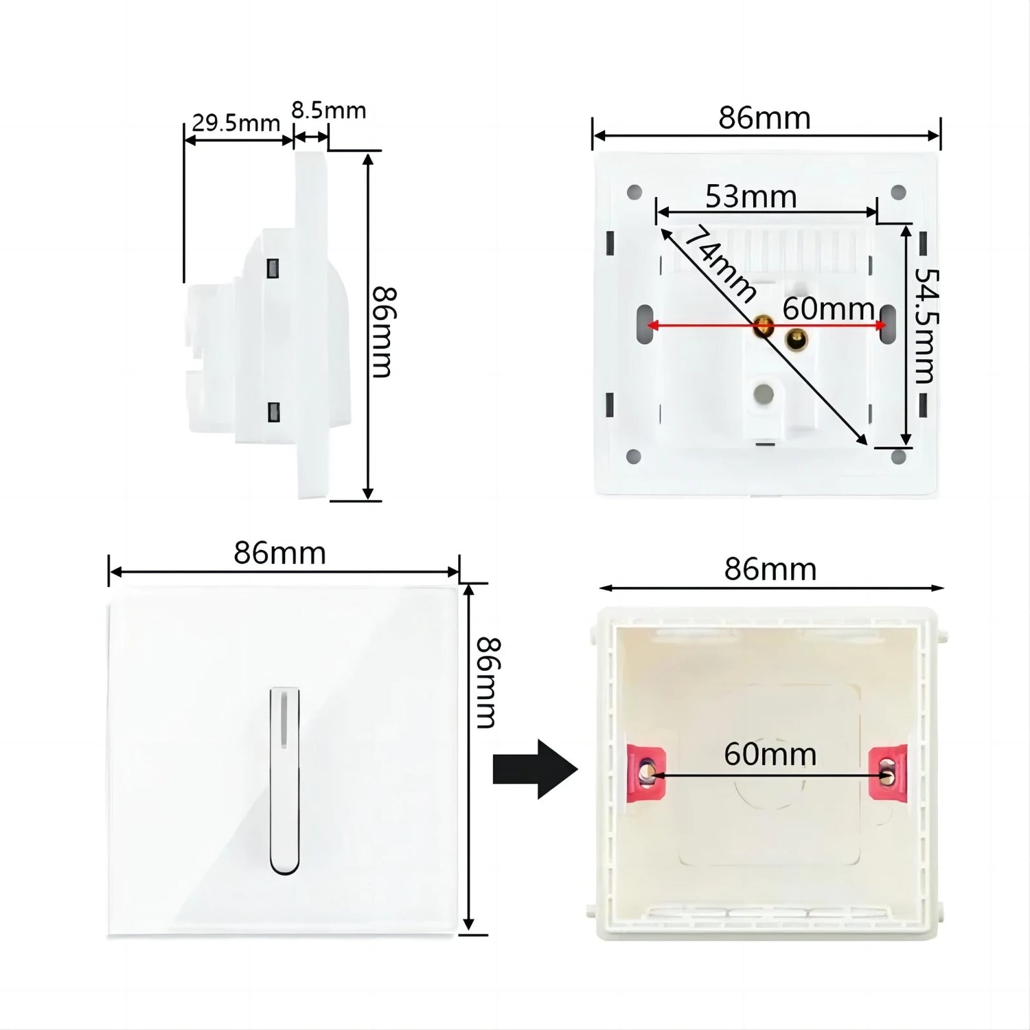 Nina Glass Panel LED Reset Button Switch - 1-4 Gang, 2 Way, 86x86mm