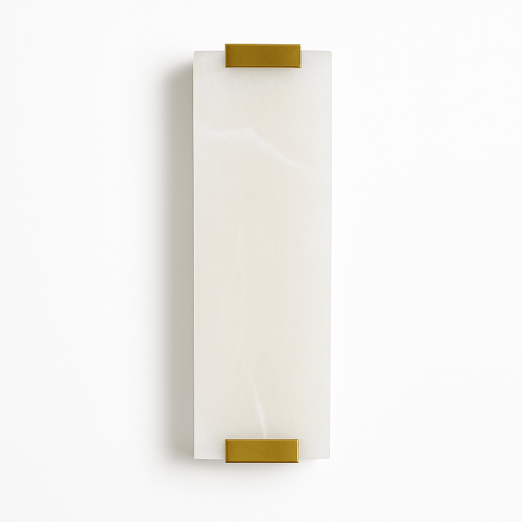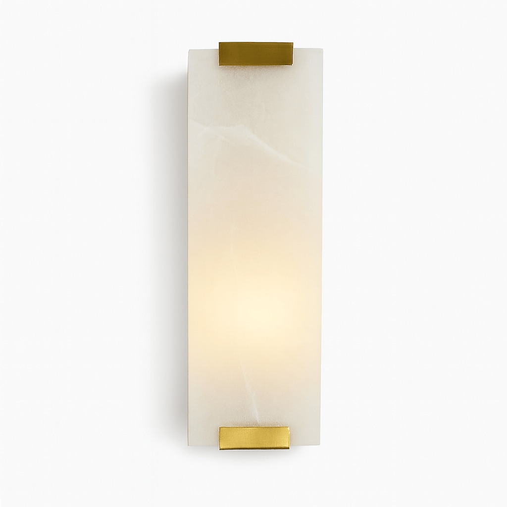 The Schouwen Wall Lamp features exquisite construction using premium brass, refined iron, and natural alabaster marble.