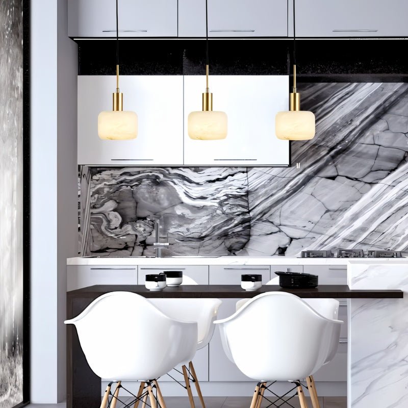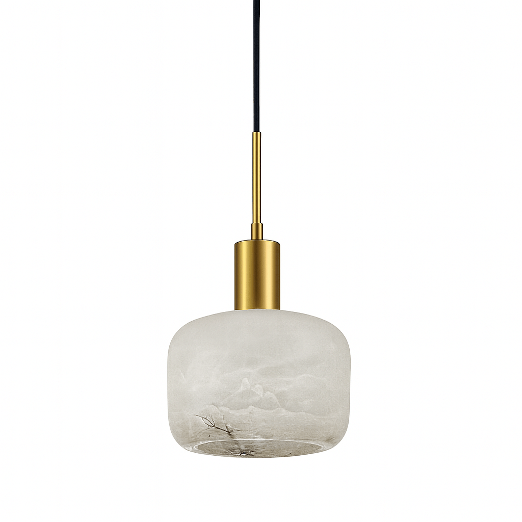 The Rubi pendant light showcases an exquisite marriage of brass and alabaster, crafting a refined and contemporary statement piece. Its sleek cylindrical alabaster shade gracefully filters light, producing a radiant, organic luminescence that transforms any environment. The metallic brass details add opulent sophistication, beautifully harmonizing with the natural stone's rich textures. Perfect for modern or transitional settings, this fixture embodies enduring elegance while delivering sumptuous ambient illumination.