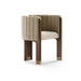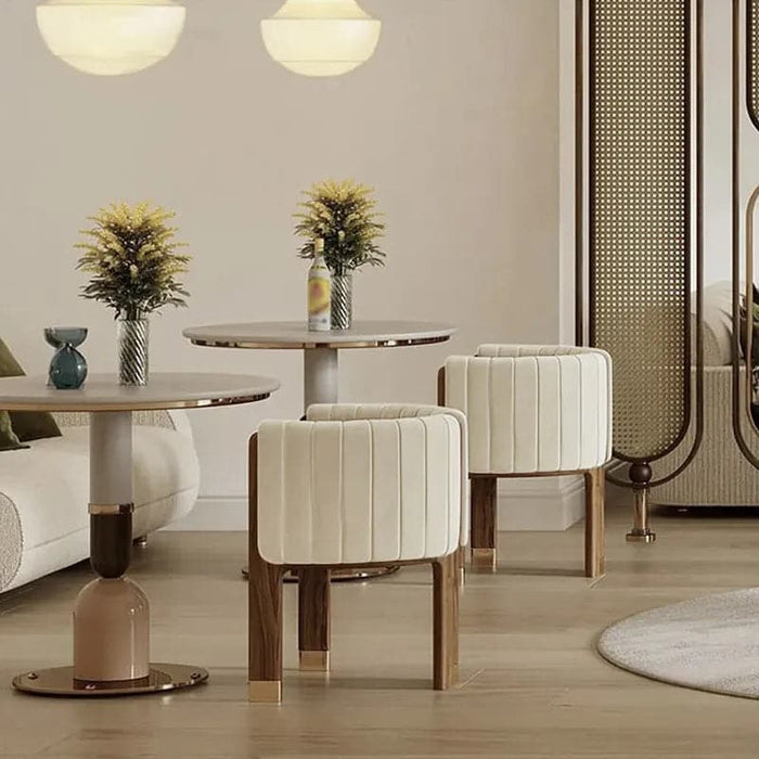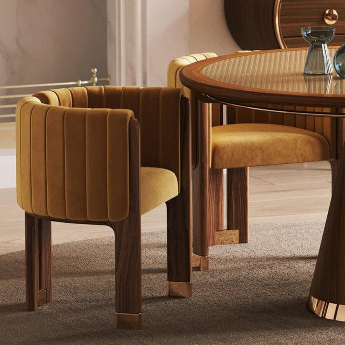 This chair boasts luxurious padding and a rounded back for a touch of modern elegance and exceptional comfort. Its sleek legs and brushed brass feet add a remarkably beautiful accent, making it an ideal complement to any dining table.