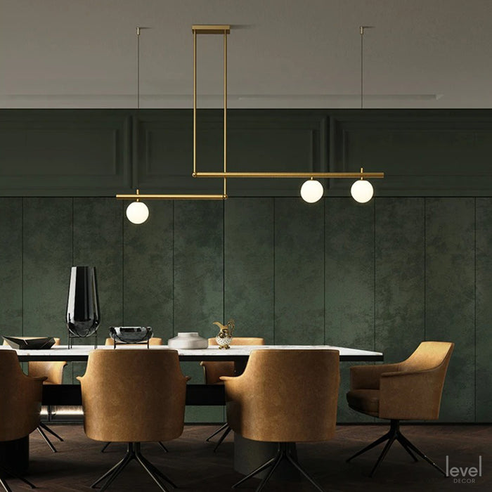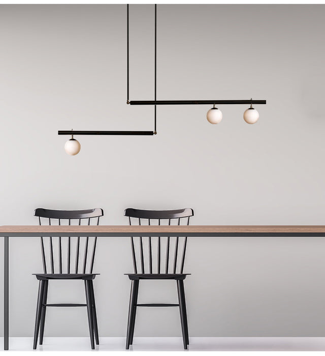 The cantilevered metal frame in this Designer Glass Ball Chandelier stems along a line connecting glass globes in all directions, creating a visually striking show piece that plays on the eyes. Choose the color of the frame and the number of glass balls you want to create a design unique to your home.