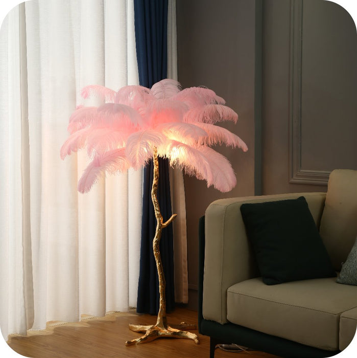 The Estelle Floor Lamp stands with a gold stem, with feathers falling smoothly into a decadent statement.